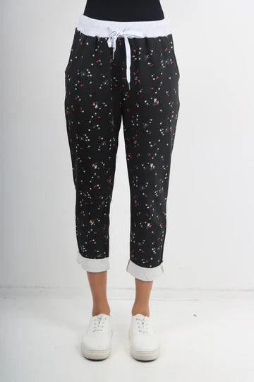 Our beautiful pants featuring an all over floral print and elsticated waist with draw string tie detailing and rolled up ankles, style with trainers and a plain T-Shirt to make the floral print pop.