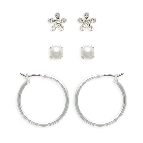 Ear Sense Earring FC321 Silver Crystal Flower/ Pearl/ Hoop Trio